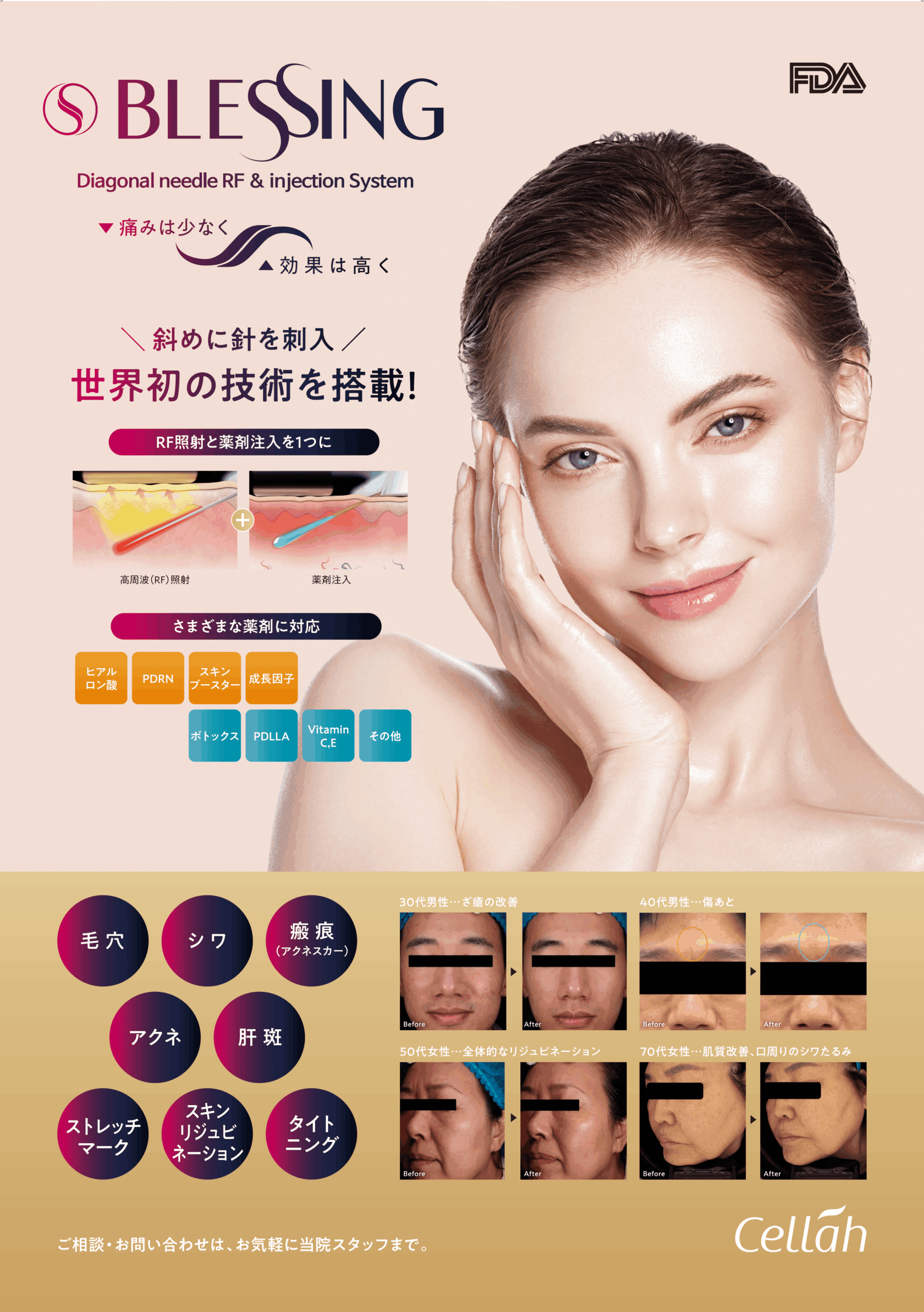 ブレッシング(BLESSING)は、医療美容業界で20年以上の経験を持つ専門家チームによって開発された、世界初の「斜角ニードルRF & インジェクションシステム」を搭載した最新デバイスです。