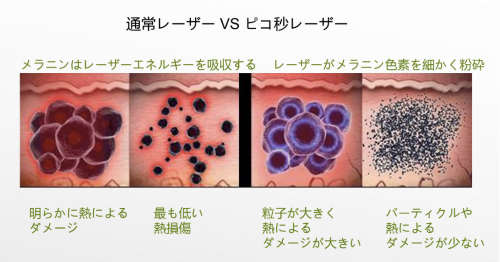 照射時間が極めて短いため、周囲の正常な組織への熱伝達が最小限に抑えられます。そのため、ヤケドや炎症後色素沈着のリスクを低減しながら、安全かつ効果的にメラニンを分解・排出させることが可能です。