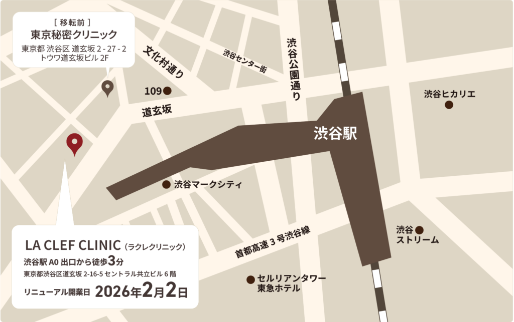 移転先は、旧クリニックからもほど近い「道玄坂セントラル共立ビル」の6階となります。 これまで以上に皆さまに寄り添い、理想の自分への「鍵(LA CLEF)」を見つけるお手伝いができるよう、スタッフ一同、より一層のサービス向上に努めてまいります。